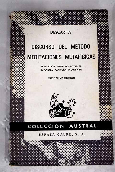 Madrid. 18 cm. 148 p. Encuadernación en tapa blanda de editorial con sobrecubierta. Colección 'Colección Austral', numero coleccion(v. 6). Descartes, René 1596-1650. Discours de la méthode. Traducció...