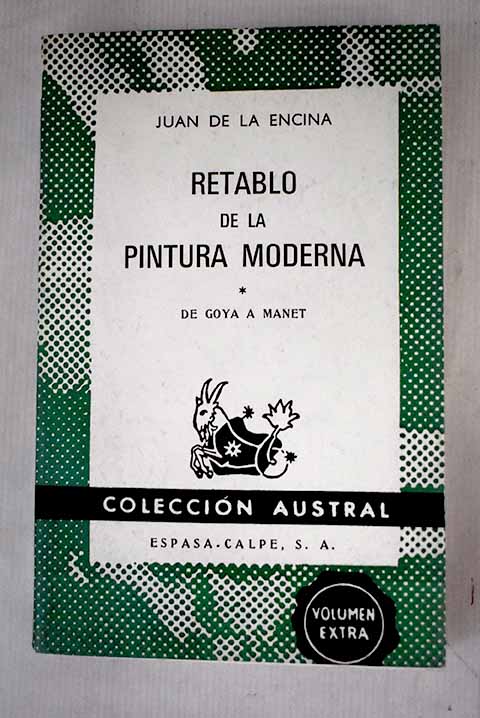 Madrid. 18 cm. 221 p. Encuadernación en tapa blanda de editorial con sobrecubierta. Colección 'Colección Austral', numero coleccion(v. 1450). Encina, Juan de la 1890-1963. I. De Goya a Manet. 223 p....