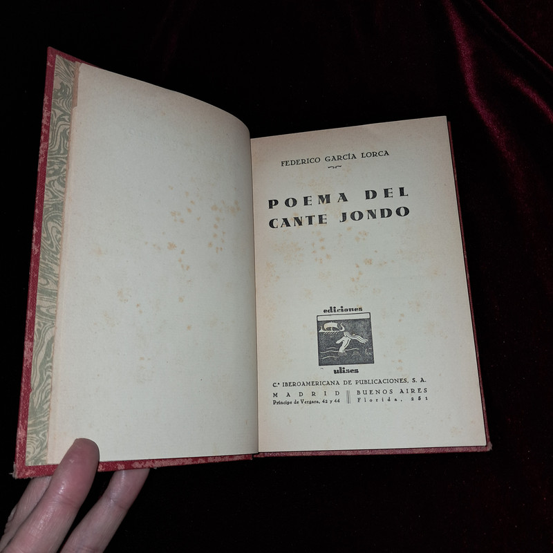POEMA DEL CANTE JONDO. 1ª ED. Federico García Lorca. Ediciones Ulises 1931. Imp. de Galo Sáez. Reencuadernado en cartoné sin las cubiertas originales. 13x19 cm. 171 pp. Dorados en lomo. Muy buen estado general, solo ligera señal de óxido en algunaS páginaS puntuales como se ve en las fotografías. Muy buen ejemplar. Quedamos a su disposición para cualquier información adicional o para facilitarle más fotografías. Puede contactarnos en el correo electrónico llibreriafenix@gmail.com