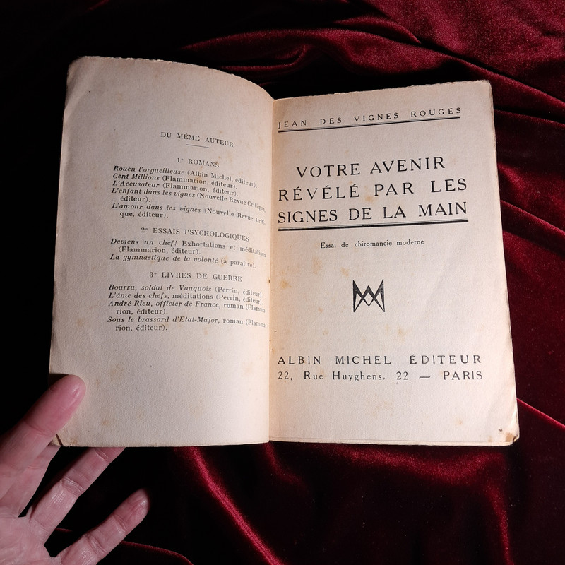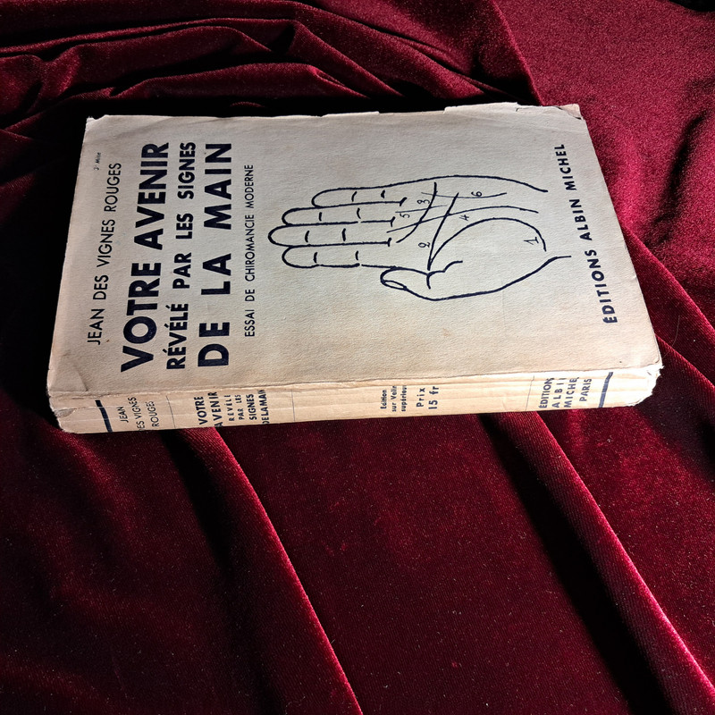 VOTRE AVENIR RÉVÉLÉ PAR LES SIGNES DE LA MAIN. ESSAI DE CHIROMACIE MODERNE. Jean des Vignes Rouges. Ed. Albin Michel 1935. Enc. Rústica. 252 pp. 12 cm. Leves rotos con pérdida de papel en cubierta como se aprecia en la foto. Por lo demás sin defectos a destacar. Muchas ilustraciones.